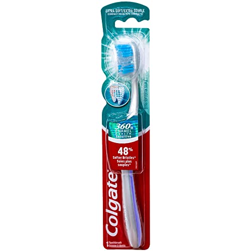The Colgate 360 Enamel Health Sensitive manual extra soft toothbrush has 48% softer bristles (vs. an ordinary soft manual toothbrush) to help protect enamel surfaces and gums. This extra soft toothbrush features a raised cleaning tip that helps get into hard-to-reach areas, polishing whitening cups that gently remove stains for a bright smile, and the unique cheek & tongue cleaner